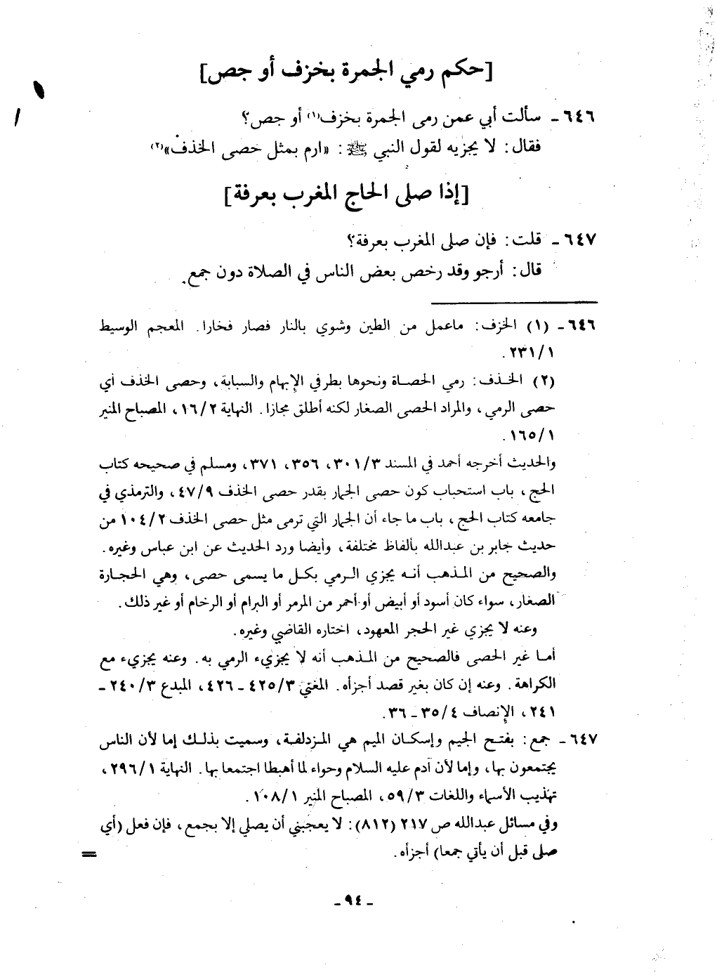 ٦٤٦ - سَأَلت أبي عَمَّن رمى الْجَمْرَة بخزف أَو جص فَقَالَ لَا يجْزِيه لقَوْل النَّبِي صلى الله عَلَيْهِ وَسلم ارْمِ بِمثل حَصى الْخذف