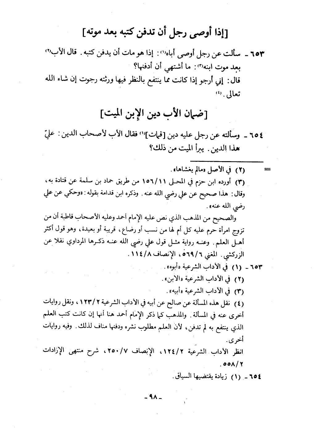 ٦٥٣ - سَأَلت عَن رجل أوصى أَبَاهُ إِذا هُوَ مَاتَ أَن يدْفن كتبه قَالَ الْأَب بعد موت ابْنه مَا اشتهي أَن أدفنها قَالَ إِنِّي أَرْجُو إِذا كَانَت مِمَّا ينْتَفع بِالنّظرِ فِيهَا ورثته رَجَوْت إِن شَاءَ الله تَعَالَى