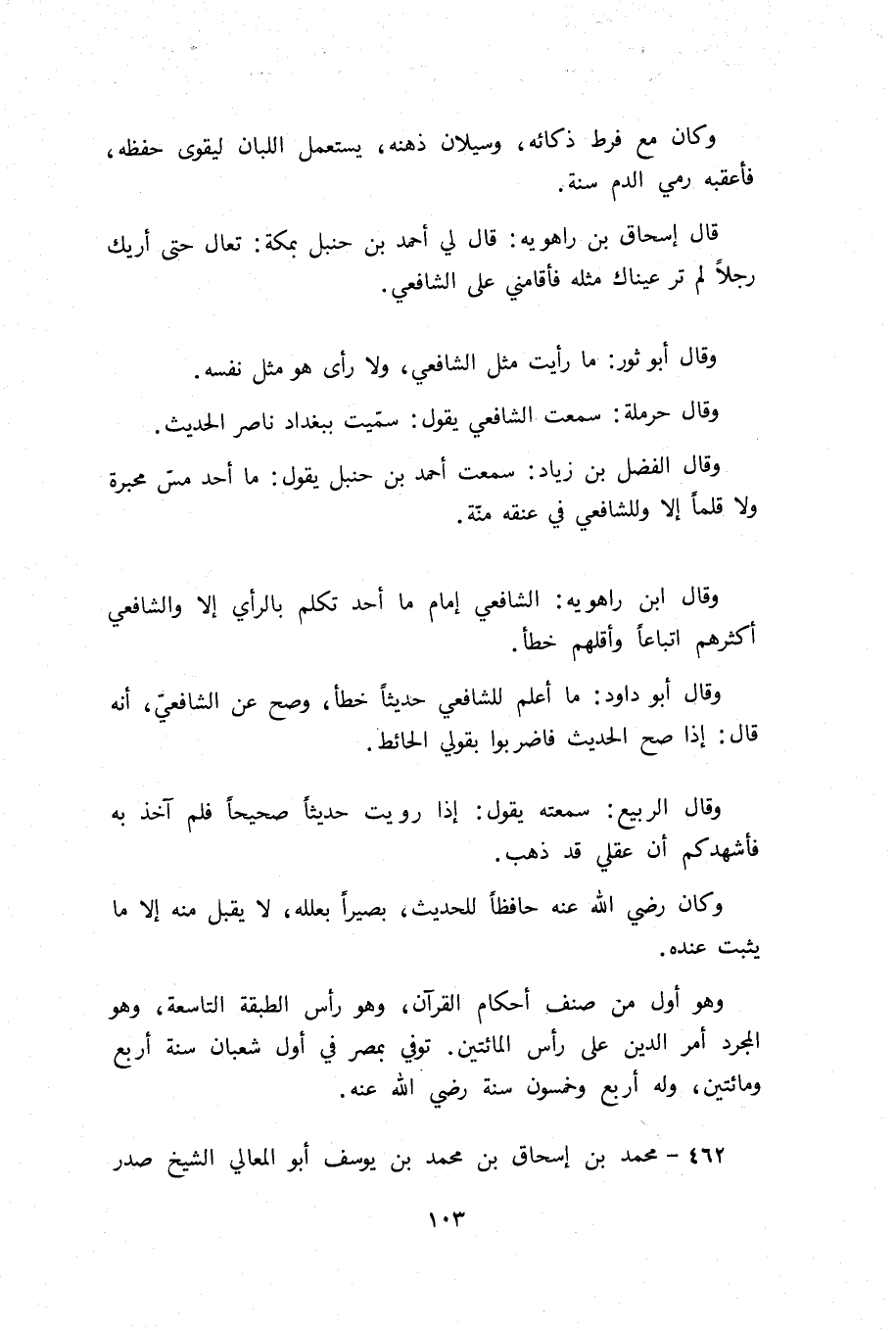 قال إسحاق بن راهويه: قال لي أحمد بن حنبل بمكة: تعال حتى أريك رجلا لم تر عيناك مثله فأقامني على الشافعي.