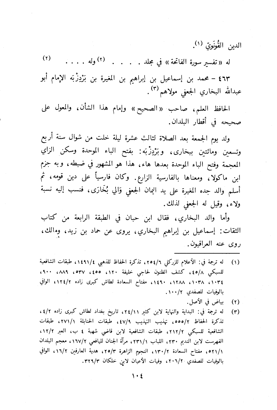 463 - محمد بن إسماعيل بن إبراهيم بن المغيرة بن بردزبة الإمام أبو عبد الله البخاري الجعفي مولاهم (¬4).