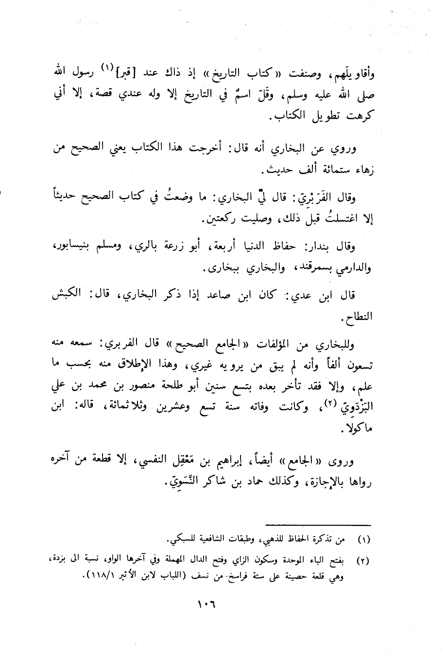 وللبخاري من المؤلفات «الجامع الصحيح» قال الفربري: سمعه منه تسعون ألفا وأنه لم يبق من يرويه غيري، وهذا الإطلاق منه بحسب ما علم، وإلا فقد تأخر بعده بتسع سنين أبو طلحة منصور بن محمد بن علي البزدويّ (¬2)، وكانت وفاته سنة تسع وعشرين وثلاثمائة، قاله: ابن ماكولا.