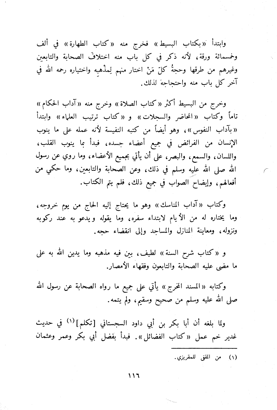 وابتدأ «بكتاب البسيط» فخرج منه «كتاب الطهارة» في ألف وخمسمائة ورقة، لأنه ذكر في كل باب منه اختلاف الصحابة والتابعين وغيرهم من طرقها وحجة كلّ من اختار منهم لمذهبه واختياره رحمه الله في آخر كل باب منه واحتجاجه لذلك.
