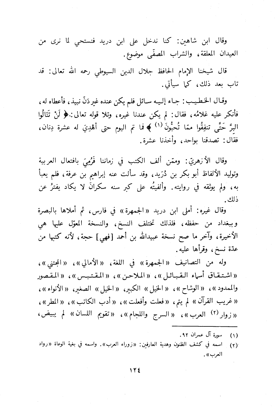 وله من التصانيف «الجمهرة» في اللغة، «الأمالي»، «المجتني»، «اشتقاق أسماء القبائل»، «الملاحن»، «المقتبس»، «المقصور والمدود»، «الوشاح»، «الخيل» الكبير، «الخيل» الصغير، «الأنواء»، «غريب القرآن» لم يتم، «فعلت وأفعلت»، «أدب الكاتب»، «المطر»، «زوار (¬2) العرب»، «السرج واللجام»، «تقويم اللسان» لم يبيض،