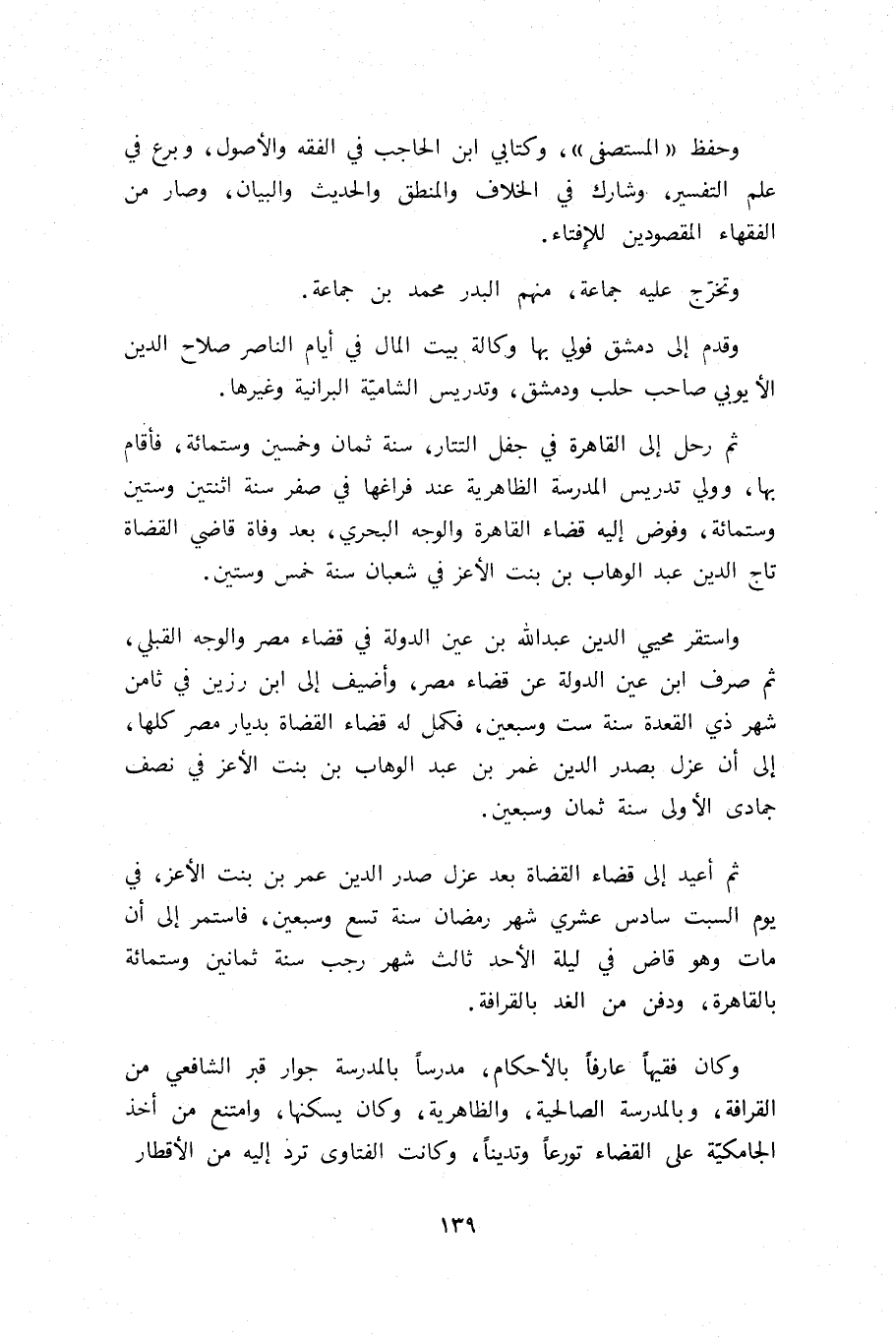 وكان فقيها عارفا بالأحكام، مدرسا بالمدرسة جوار قبر الشافعي من القرافة، وبالمدرسة الصالحية، والظاهرية، وكان يسكنها، وامتنع من أخذ الجامكيّة على القضاء تورعا وتدينا، وكانت الفتاوى ترد إليه من الأقطار