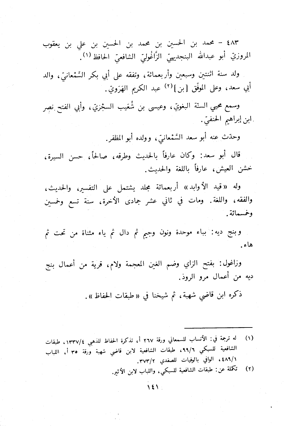(¬1) له ترجمة في: الأنساب للسمعاني ورقة 267 أ، تذكرة الحفاظ للذهبي 4/ 1337، طبقات الشافعية للسبكي 6/ 99، طبقات الشافعية لابن قاضي شهبة ورقة 35 أ، اللباب 1/ 489، الوافي بالوفيات للصفدي 2/ 373.