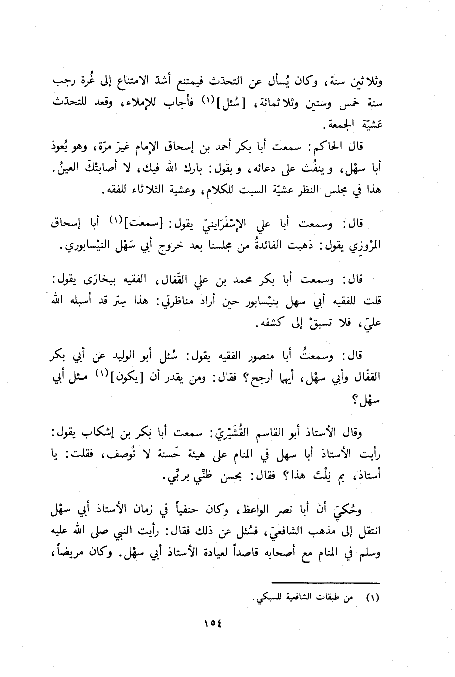 قال: وسمعت أبا منصور الفقيه يقول: سئل أبو الوليد عن أبي بكر القفّال وأبي سهل، أيهما أرجح؟ فقال: ومن يقدر أن [يكون] (¬3) مثل أبي سهل؟