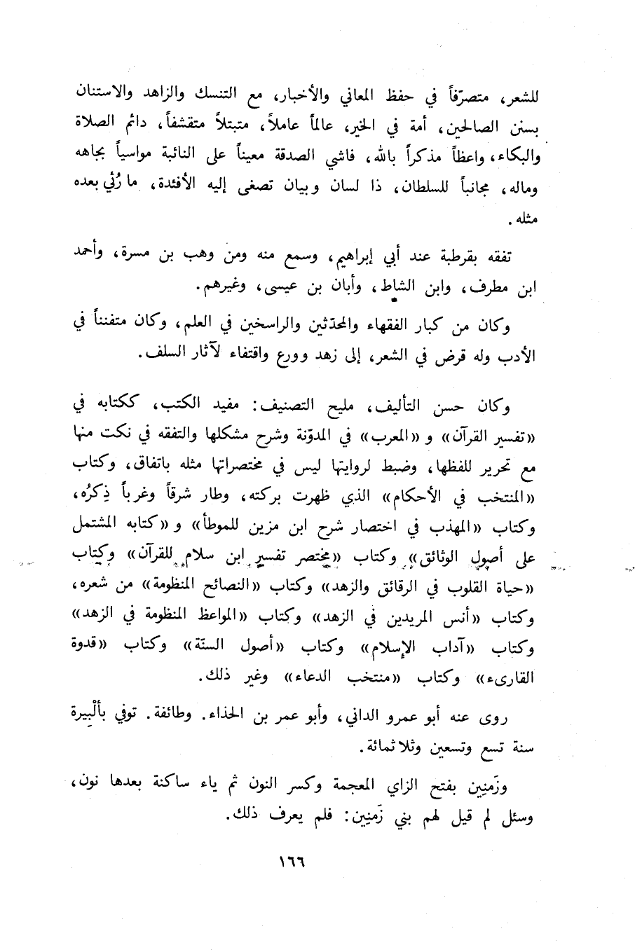 للشعر، متصرّفا في حفظ المعاني والأخبار، مع التنسك والزاهد والاستنان بسنن الصالحين، أمة في الخير، عالما عاملا، متبتلا متقشفا، دائم الصلاة والبكاء، واعظا مذكرا بالله، فاشي الصدقة معينا على النائبة مواسيا بجاهه وماله، مجانبا للسلطان، ذا لسان وبيان تصغى إليه الأفئدة، ما رئي بعده مثله.
