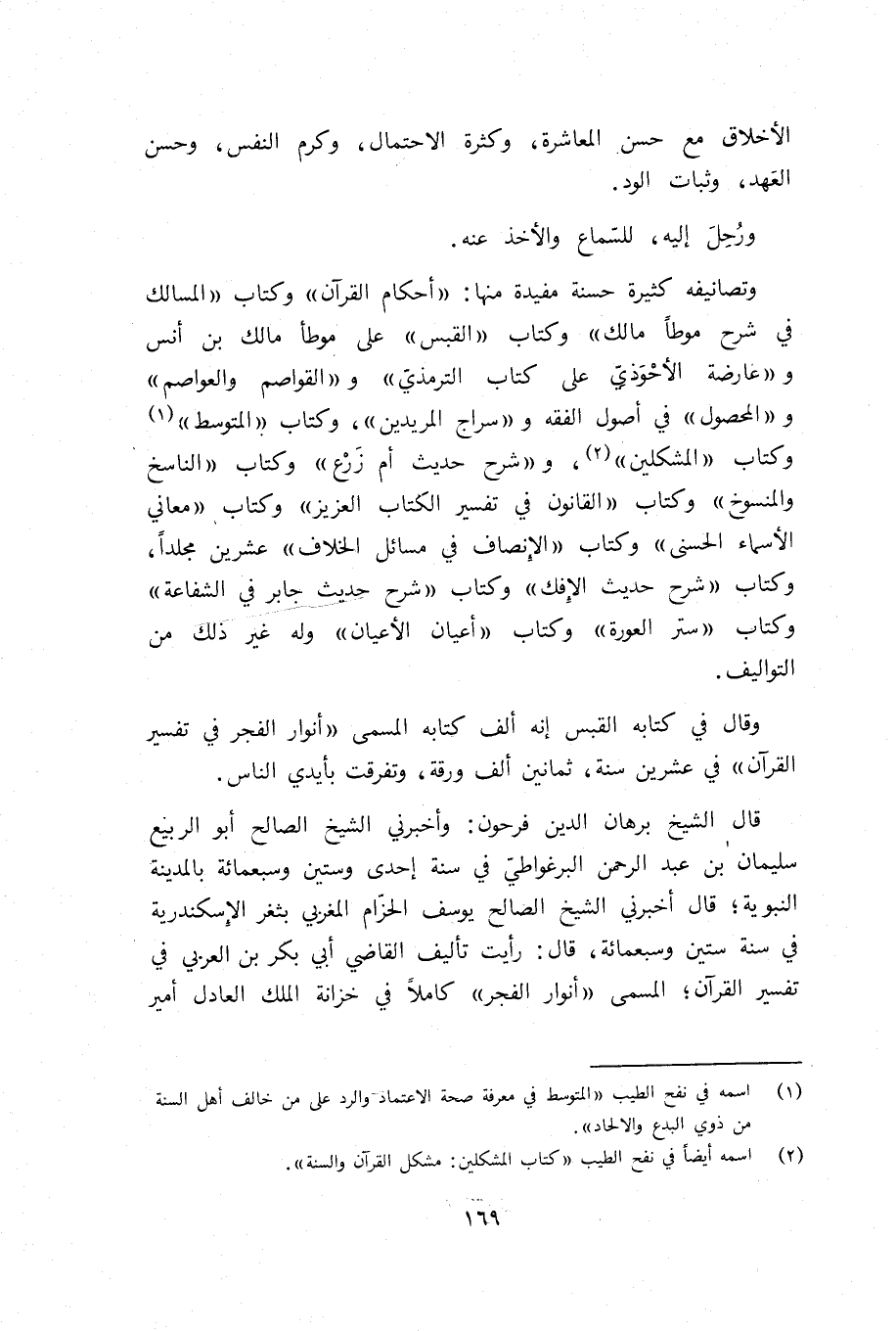 وتصانيفه كثيرة حسنة مفيدة منها: «أحكام القرآن» وكتاب «المسالك في شرح موطّإ مالك» وكتاب «القبس» على موطأ مالك بن أنس و «عارضة الأحوذيّ على كتاب الترمذيّ» و «القواصم والعواصم» و «المحصول» في أصول الفقه و «سراج المريدين»، وكتاب «المتوسط» (¬1) وكتاب «المشكلين» (¬2)، و «شرح حديث أم زرع» وكتاب «الناسخ والمنسوخ» وكتاب «القانون في تفسير الكتاب العزيز» وكتاب «معاني الأسماء الحسنى» وكتاب «الإنصاف في مسائل الخلاف» عشرين مجلدا، وكتاب «شرح حديث الإفك» وكتاب «شرح حديث جابر في الشفاعة» وكتاب «ستر العورة» وكتاب «أعيان الأعيان» وله غير ذلك من التواليف.