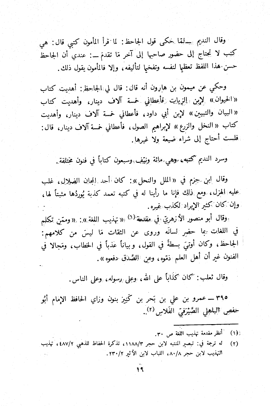 الجاحظ، وكان أوتي بسطة في القول، وبيانا عذبا في الخطاب، ومجالا في الفنون غير أن أهل العلم ذمّوه، وعن الصّدق دفعوه».
