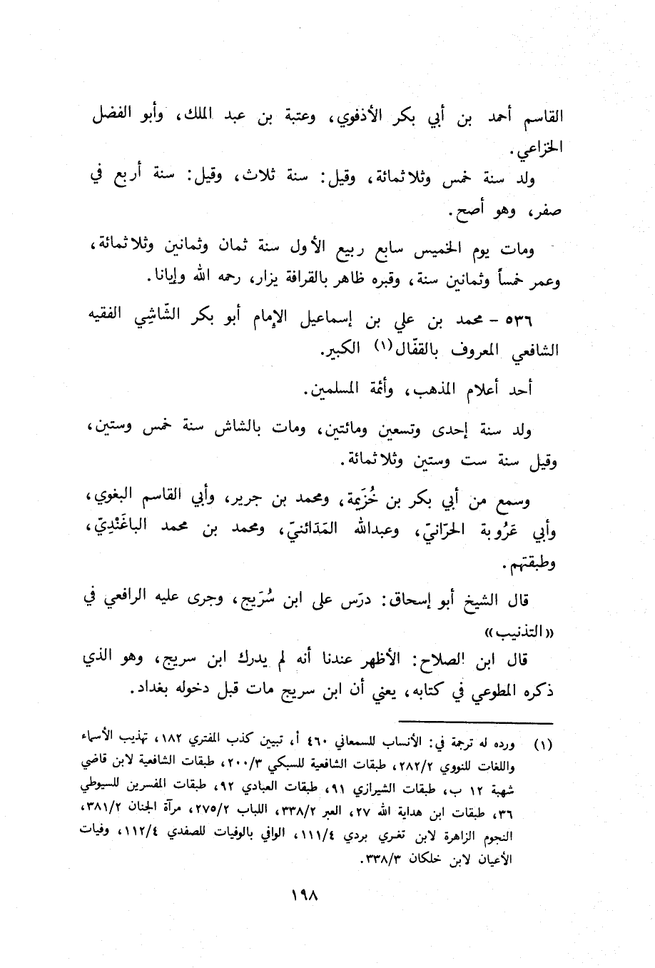 536 - محمد بن علي بن إسماعيل الإمام أبو بكر الشّاشي الفقيه الشافعي المعروف بالقفّال (¬1) الكبير.