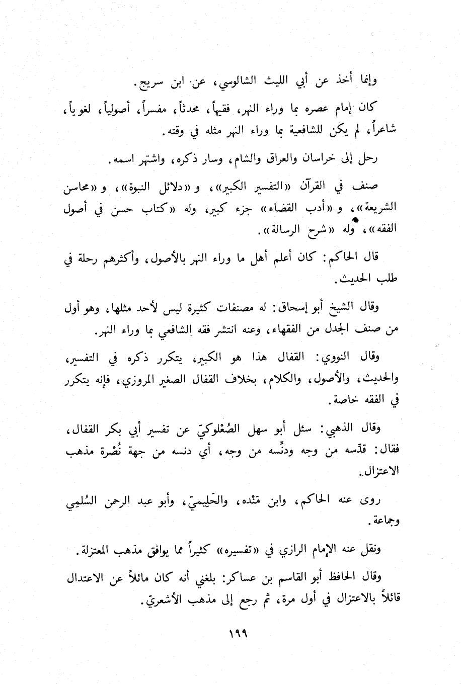 وقال النووي: القفال هذا هو الكبير، يتكرر ذكره في التفسير، والحديث، والأصول، والكلام، بخلاف القفال الصغير المروزي، فإنه يتكرر في الفقه خاصة.