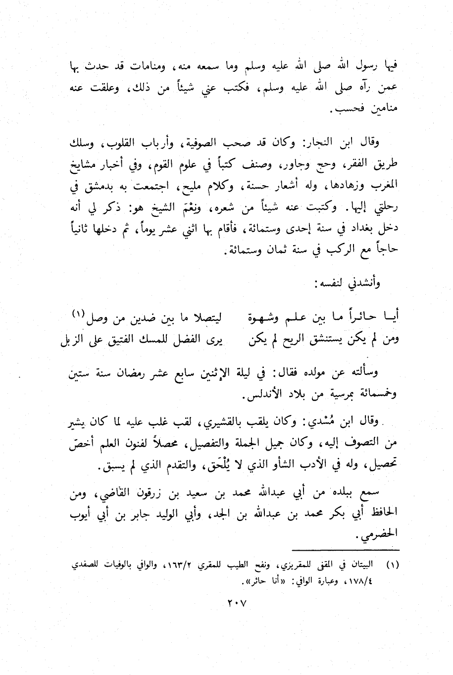 (¬1) البيتان في المقفى للمقريزي، ونفح الطيب للمقري 2/ 163، والوافي بالوفيات للصفدي 4/ 178، وعبارة الوافي: «أنا حائر».