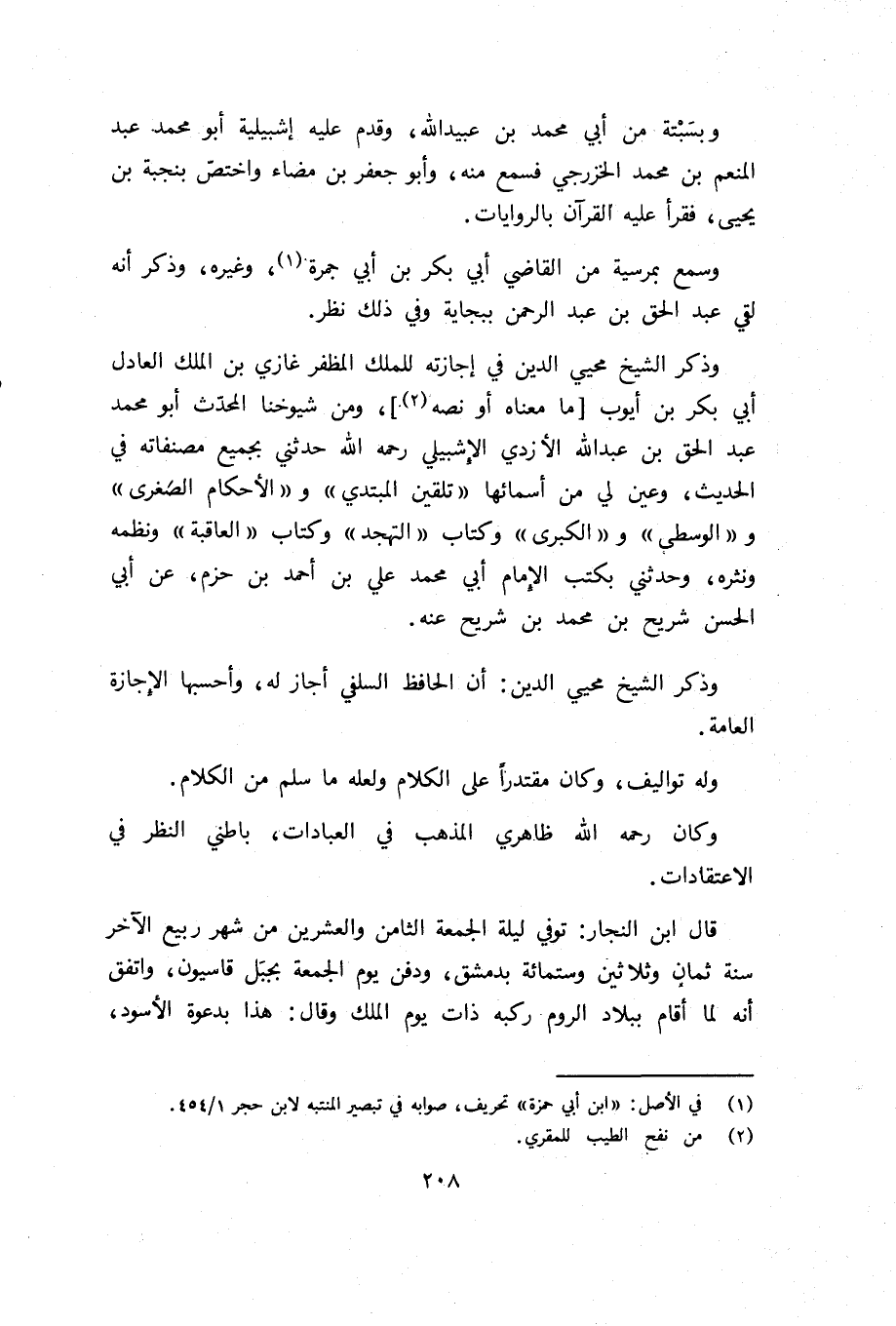 وذكر الشيخ محيي الدين في إجازته للملك المظفر غازي بن الملك العادل أبي بكر بن أيوب [ما معناه أو نصه (¬2)]، ومن شيوخنا المحدّث أبو محمد عبد الحق بن عبد الله الأزدي الإشبيلي رحمه الله حدثني بجميع مصنفاته في الحديث، وعين لي من أسمائها «تلقين المبتدي» و «الأحكام الصغرى» و «الوسطى» و «الكبرى» وكتاب «التهجد» وكتاب «العاقبة» ونظمه ونثره، وحدثني بكتب الإمام أبي محمد علي بن أحمد بن حزم، عن أبي الحسن شريح بن محمد بن شريح عنه.
