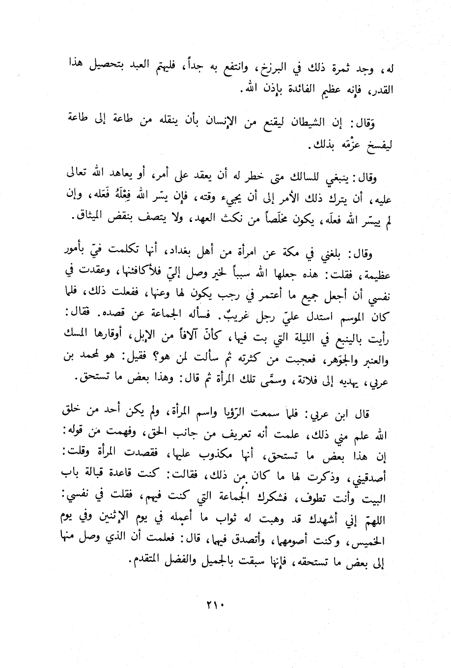 وقال: ينبغي للسالك متى خطر له أن يعقد على أمر، أو يعاهد الله تعالى عليه، أن يترك ذلك الأمر إلى أن يجيء وقته، فإن يسّر الله فعله فعله، وإن لم ييسّر الله فعله، يكون مخلصا من نكث العهد، ولا يتصف بنقض الميثاق.