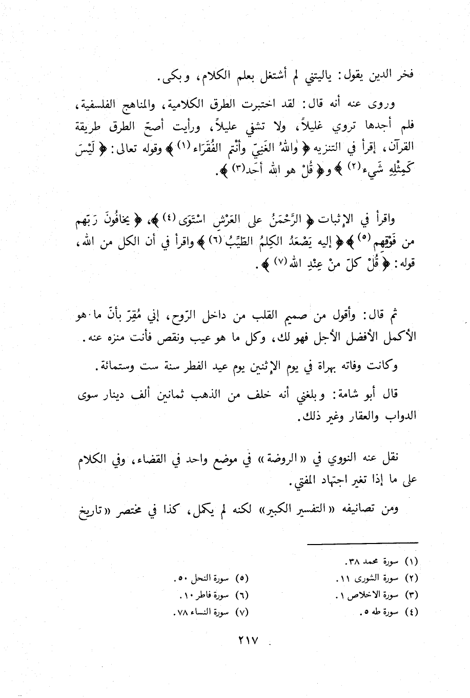 وروى عنه أنه قال: لقد اختبرت الطرق الكلامية، والمناهج الفلسفية، فلم أجدها تروي غليلا، ولا تشفي عليلا، ورأيت أصحّ الطرق طريقة القرآن، اقرأ في التنزيه وَاللَّهُ الْغَنِيُّ وَأَنْتُمُ الْفُقَراءُ (¬1) وقوله تعالى: لَيْسَ كَمِثْلِهِ شَيْءٌ (¬2) وقُلْ هُوَ اللَّهُ أَحَدٌ (¬3).