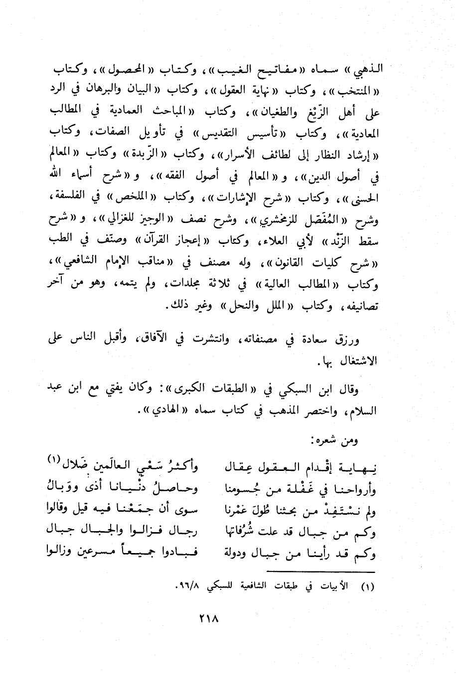 الذهبي» سماه «مفاتيح الغيب»، وكتاب «المحصول»، وكتاب «المنتخب»، وكتاب «نهاية العقول»، وكتاب «البيان والبرهان في الرد على أهل الزيغ والطغيان»، وكتاب «المباحث العمادية في المطالب المعادية»، وكتاب «تأسيس التقديس» في تأويل الصفات، وكتاب «إرشاد النظار إلى لطائف الأسرار»، وكتاب «الزّبدة» وكتاب «المعالم في أصول الدين»، و «المعالم في أصول الفقه»، و «شرح أسماء الله الحسنى»، وكتاب «شرح الإشارات»، وكتاب «الملخص» في الفلسفة، وشرح «المفصّل للزمخشري»، وشرح نصف «الوجيز للغزالي»، و «شرح سقط الزّند» لأبي العلاء، وكتاب «إعجاز القرآن» وصنّف في الطب «شرح كليات القانون»، وله مصنف في «مناقب الإمام الشافعي»، وكتاب «المطالب العالية» في ثلاثة مجلدات، ولم يتمه، وهو من آخر تصانيفه، وكتاب «الملل والنحل» وغير ذلك.