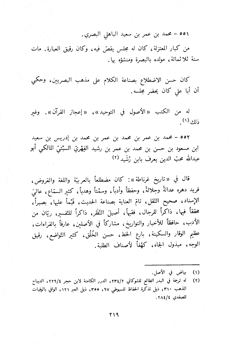 552 - محمد بن عمر بن محمد بن عمر بن محمد بن إدريس بن سعيد ابن مسعود بن حسن بن محمد بن عمر بن رشيد الفهريّ السبتيّ المالكي أبو عبد الله محبّ الدين يعرف بابن رشيد (¬2).