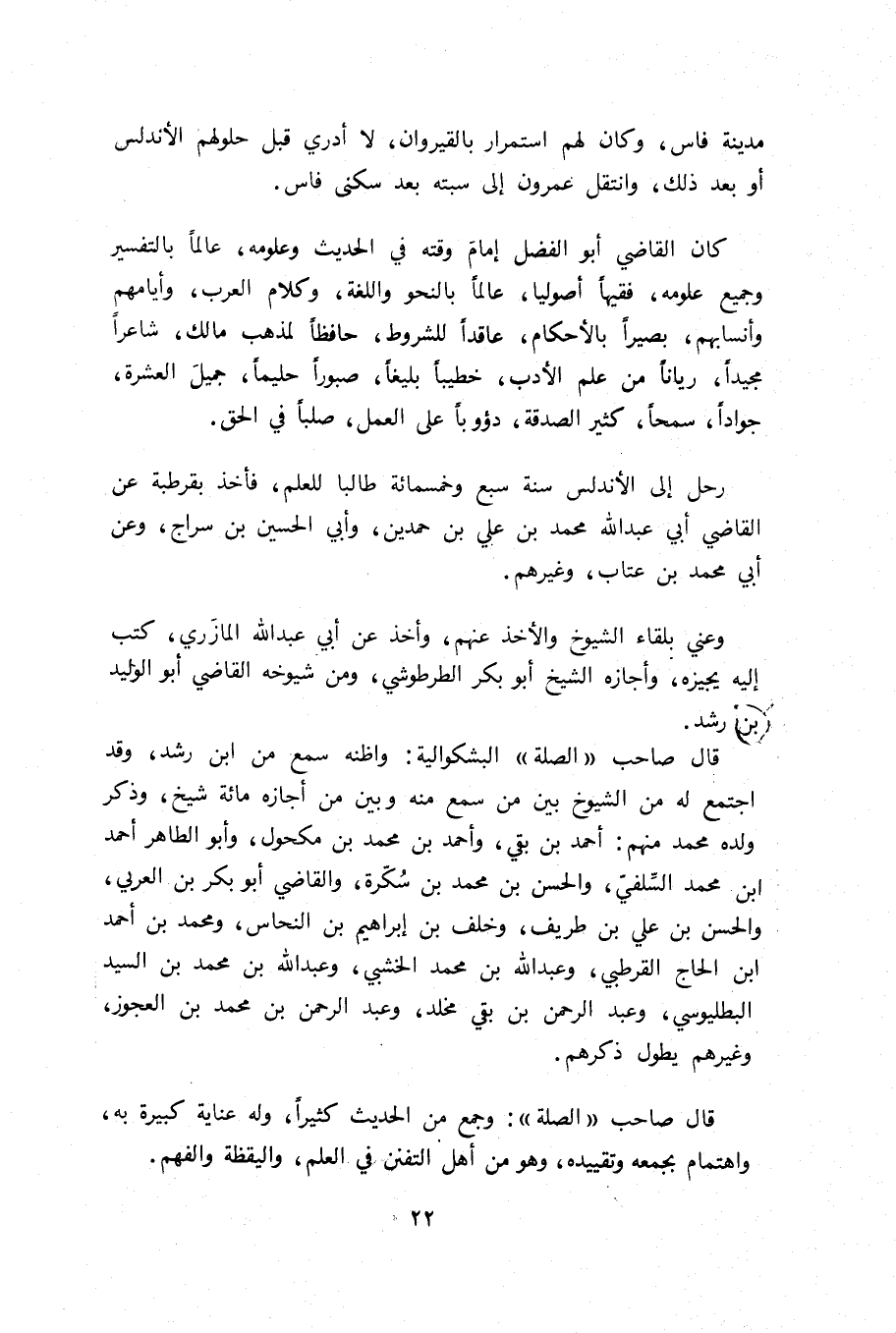 كان القاضي أبو الفضل إمام وقته في الحديث وعلومه، عالما بالتفسير وجميع علومه، فقيها أصوليا، عالما بالنحو واللغة، وكلام العرب، وأيامهم وأنسابهم، بصيرا بالأحكام، عاقدا للشروط، حافظا لمذهب مالك، شاعرا مجيدا، ريانا من علم الأدب، خطيبا بليغا، صبورا حليما، جميل العشرة، جوادا، سمحا، كثير الصدقة، دءوبا على العمل،