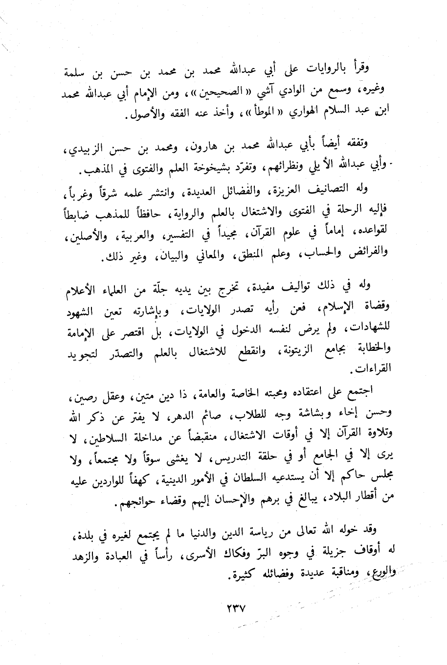 وله التصانيف العزيزة، والفضائل العديدة، وانتشر علمه شرقا وغربا، فإليه الرحلة في الفتوى والاشتغال بالعلم والرواية، حافظا للمذهب ضابطا لقواعده، إماما في علوم القرآن، مجيدا في التفسير، والعربية، والأصلين، والفرائض والحساب، وعلم المنطق، والمعاني والبيان، وغير ذلك.