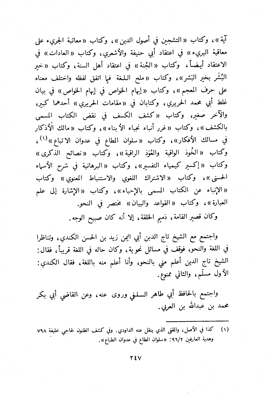 آية»، وكتاب «التشحين في أصول الدين»، وكتاب «معاتبة الجريء على معاقبة البريء» في اعتقاد أبي حنيفة والأشعري، وكتاب «العادات» في الاعتقاد أيضا، وكتاب «الجنة» في اعتقاد أهل السنة، وكتاب «خير البشر بخير البشر»، وكتاب «ملح اللغة فيما اتفق لفظه واختلف معناه على حرف المعجم»، وكتاب «إبهام الخواص في إبهام الخواص» في بيان غلط أبي محمد الحريري، وكتابان في «مقامات الحريري» أحدهما كبير، والآخر صغير، وكتاب «كشف الكسف في نقض الكتاب المسمى بالكشف»، وكتاب «غرر أنباء نجباء الأبناء»، وكتاب «مالك الأذكار في مسالك الأفكار»، وكتاب «سلوان المطاع في عدوان الاتباع» (¬1)، وكتاب «الخوذ الواقية والعوذ الراقية»، وكتاب «نصائح الذكرى» وكتاب «إكسير كيمياء التفسير»، وكتاب «البرهانية في شرح الأسماء الحسنى»، وكتاب «الاشتراك اللغوي والاستنباط المعنوي» وكتاب «الإنباء عن الكتاب المسمى بالإحياء»، وكتاب «الإشارة إلى علم العبارة»، وكتاب «القواعد والبيان» مختصر في النحو.