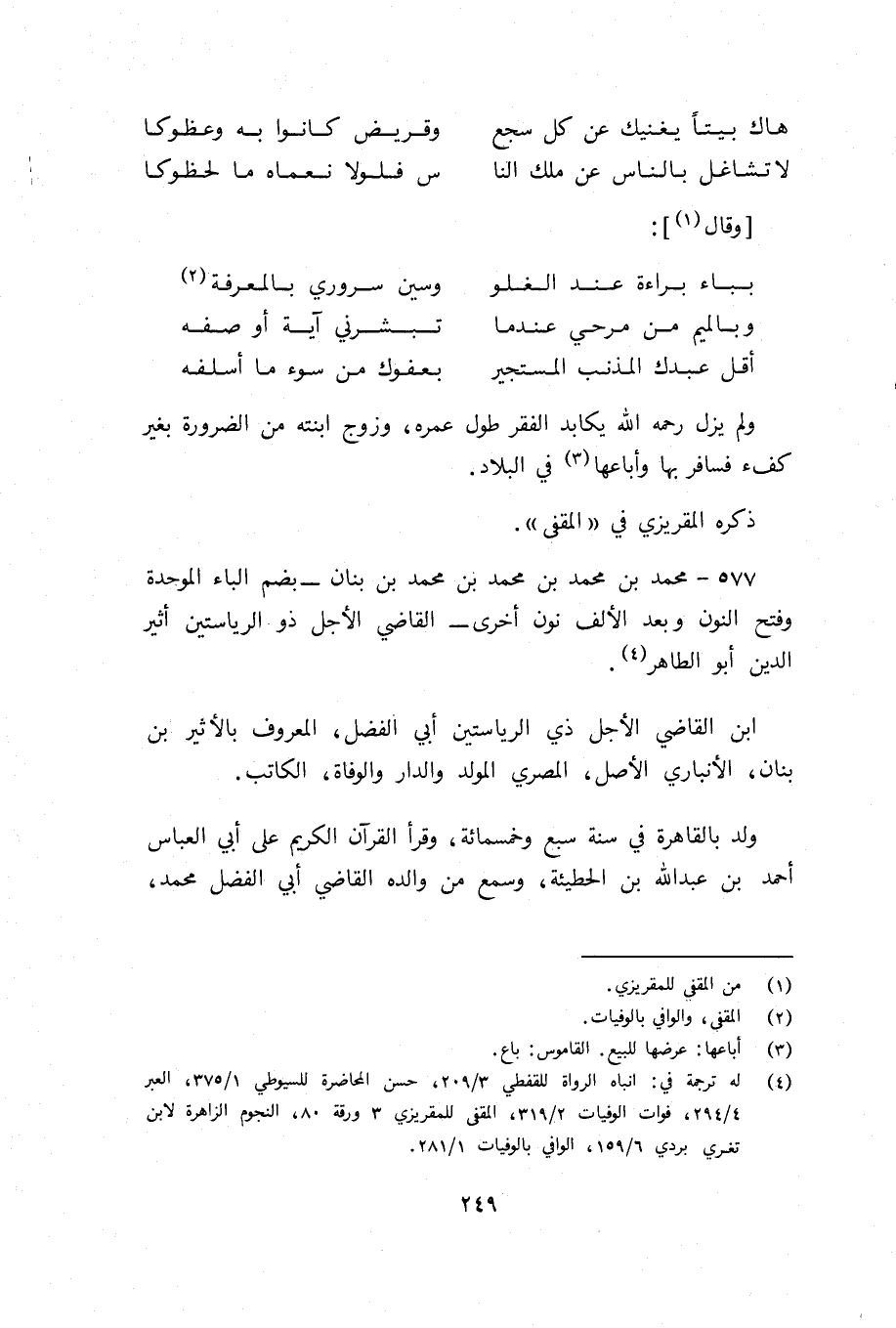 (¬4) له ترجمة في: انباه الرواة للقفطي 3/ 209، حسن المحاضرة للسيوطي 1/ 375، العبر 4/ 294، فوات الوفيات 2/ 319، المقفى للمقريزي 3 ورقة 80، النجوم الزاهرة لابن تغري بردي 6/ 159، الوافي بالوفيات 1/ 281.