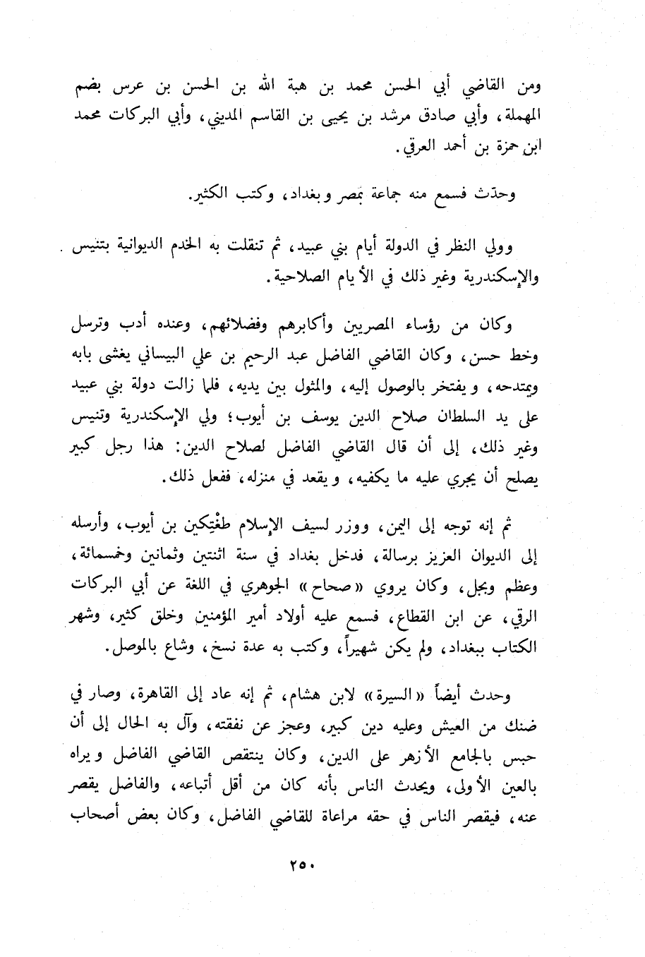 وحدث أيضا «السيرة» لابن هشام، ثم إنه عاد إلى القاهرة، وصار في ضنك من العيش وعليه دين كبير، وعجز عن نفقته، وآل به الحال إلى أن حبس بالجامع الأزهر على الدين، وكان ينتقص القاضي الفاضل ويراه بالعين الأولى، ويحدث الناس بأنه كان من أقل أتباعه، والفاضل يقصر عنه، فيقصر الناس في حقه مراعاة للقاضي الفاضل، وكان بعض أصحاب
