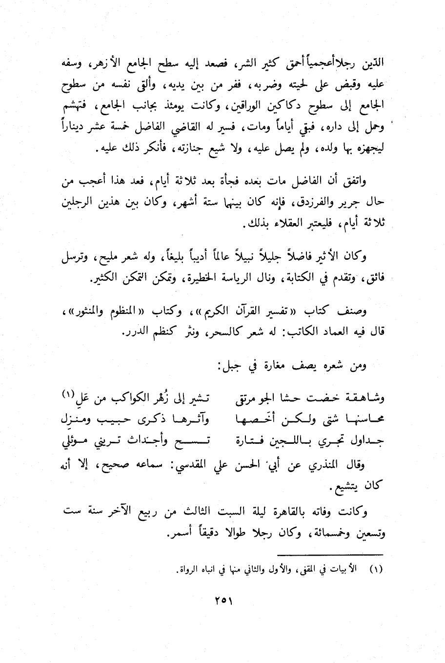 واتفق أن الفاضل مات بعده فجأة بعد ثلاثة أيام، فعد هذا أعجب من حال جرير والفرزدق، فإنه كان بينهما ستة أشهر، وكان بين هذين الرجلين ثلاثة أيام، فليعتبر العقلاء بذلك.