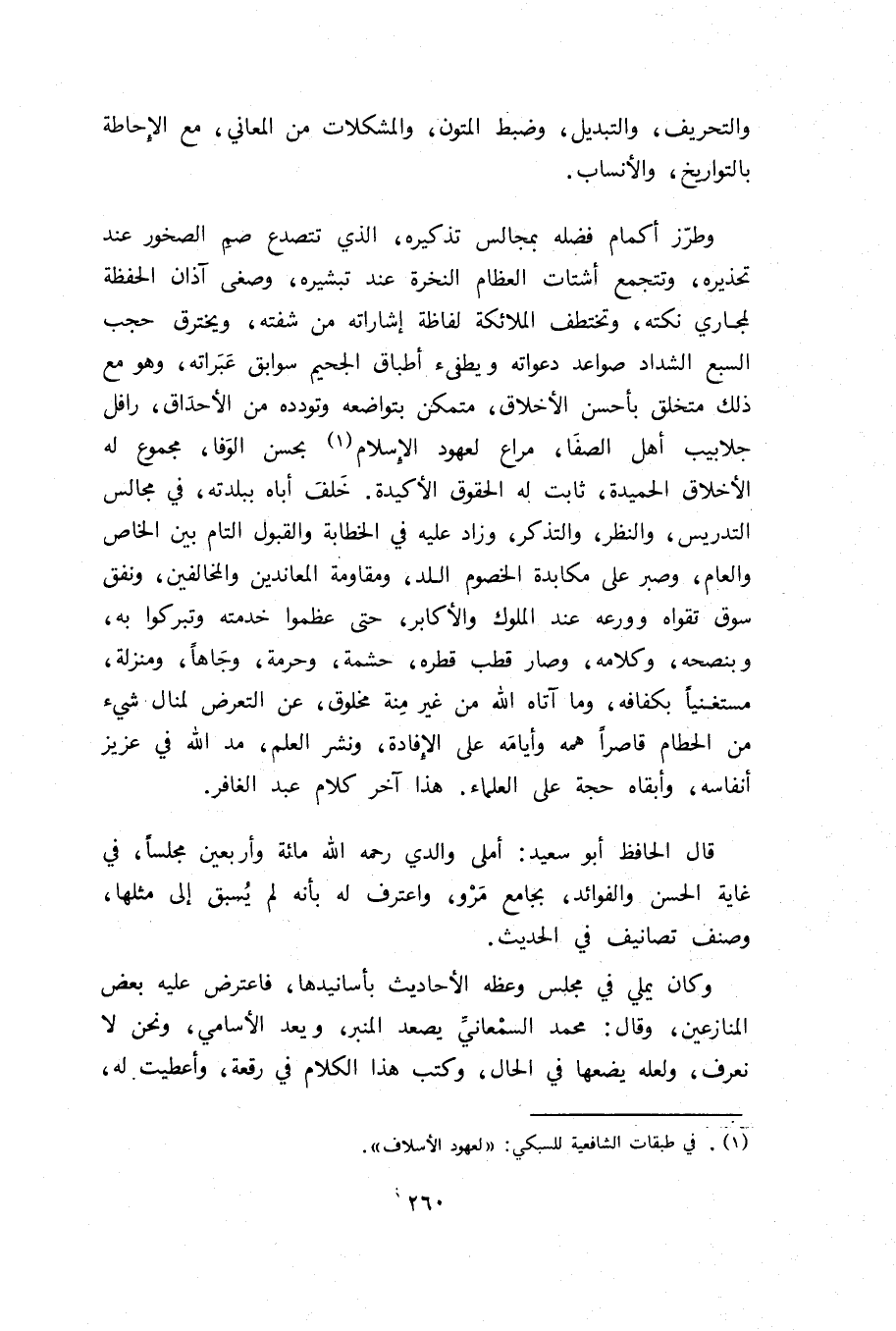 وتودده من الأحداق، رافل جلابيب أهل الصفا، مراع لعهود الإسلام (¬1) بحسن الوفا، مجموع له الأخلاق الحميدة، ثابت له الحقوق الأكيدة. خلف أباه ببلدته، في مجالس التدريس، والنظر، والتذكر، وزاد عليه في الخطابة والقبول التام بين الخاص والعام، وصبر على مكابدة الخصوم اللد، ومقاومة المعاندين والمخالفين، ونفق سوق تقواه وورعه عند الملوك والأكابر، حتى عظموا خدمته وتبركوا به، وبنصحه، وكلامه، وصار قطب قطره، حشمة، وحرمة، وجاها، ومنزلة، مستغنيا بكفافه، وما آتاه الله من غير منة مخلوق، عن التعرض لمنال شيء من الحطام قاصرا همه وأيامه على الإفادة، ونشر العلم، مد الله في عزيز أنفاسه، وأبقاه حجة على العلماء. هذا آخر كلام عبد الغافر.