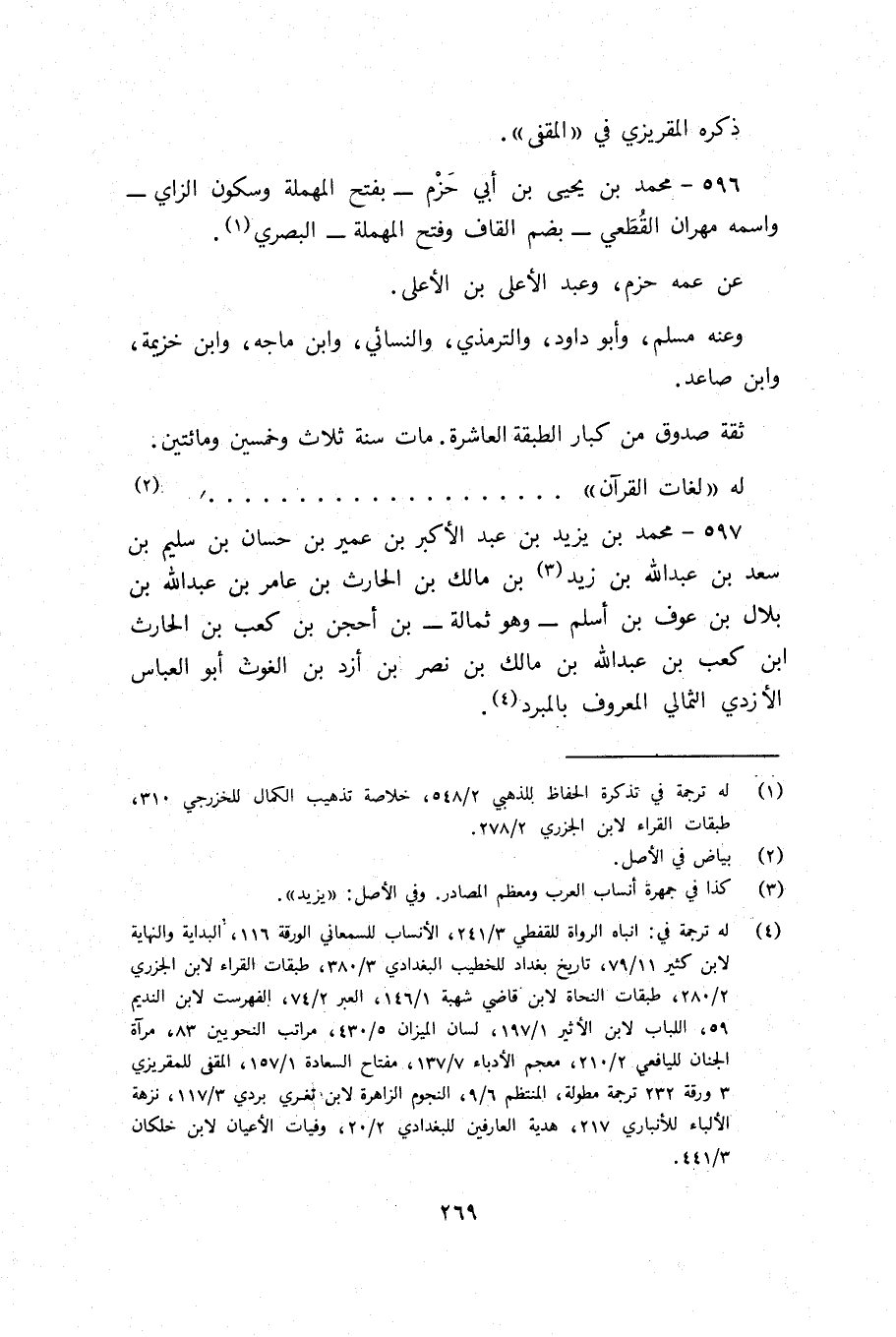 597 - محمد بن يزيد بن عبد الأكبر بن عمير بن حسان بن سليم بن سعد بن عبد الله بن زيد (¬3) بن مالك بن الحارث بن عامر بن عبد الله بن بلال بن عوف بن أسلم- وهو ثمالة- بن أحجن بن كعب بن الحارث ابن كعب بن عبد الله بن مالك بن نصر بن أزد بن الغوث أبو العباس الأزدي الثمالي المعروف بالمبرد (¬4).