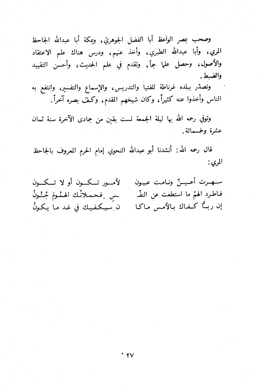 قال رحمه الله: أنشدنا أبو عبد الله النحوي إمام الحرم المعروف بالجاحظ المري: