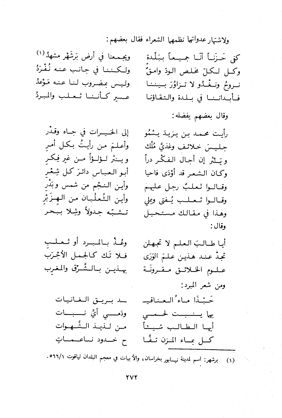 (¬1) برشهر: اسم لمدينة نيسابور بخراسان، والأبيات في معجم البلدان لياقوت 1/ 566.