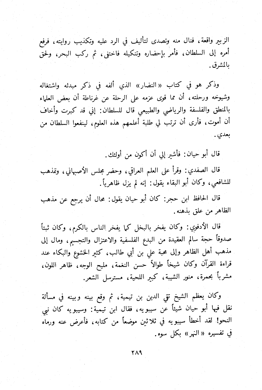 وكان يعظم الشيخ تقي الدين بن تيمية، ثم وقع بينه وبينه في مسألة نقل فيها أبو حيان شيئا عن سيبويه، فقال ابن تيمية: وسيبويه كان نبي النحو! لقد أخطأ سيبويه في ثلاثين موضعا من كتابه، فأعرض عنه ورماه في تفسيره «النهر» بكل سوء.