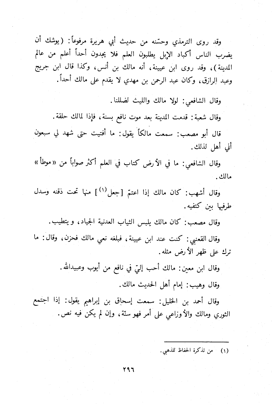 وقد روى الترمذي وحسّنه من حديث أبي هريرة مرفوعا: (يوشك أن يضرب الناس أكباد الإبل يطلبون العلم فلا يجدون أحدا أعلم من عالم المدينة)، وقد روى ابن عيينة، أنه مالك بن أنس، وكذا قال ابن جريج وعبد الرازق، وكان عبد الرحمن بن مهدي لا يقدم على مالك أحدا.
