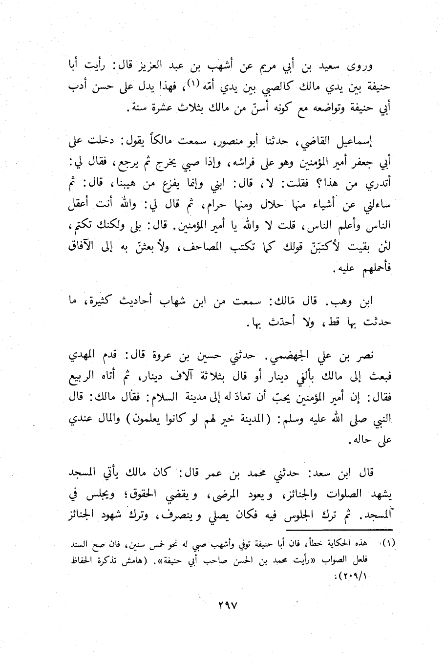 (¬1) هذه الحكاية خطأ، فان أبا حنيفة توفي وأشهب صبي له نحو خمس سنين، فان صح السند فلعل الصواب «رأيت محمد بن الحسن صاحب أبي حنيفة». (هامش تذكرة الحفاظ 1/ 209).