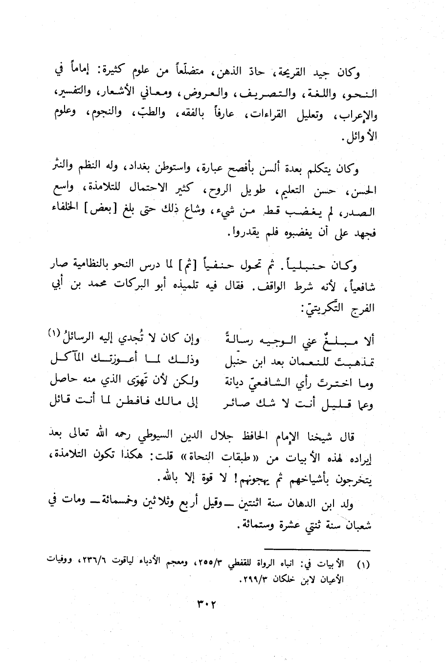 وكان حنبليا. ثم تحول حنفيا [ثم] لما درس النحو بالنظامية صار شافعيا، لأنه شرط الواقف. فقال فيه تلميذه أبو البركات محمد بن أبي الفرج التّكريتيّ: