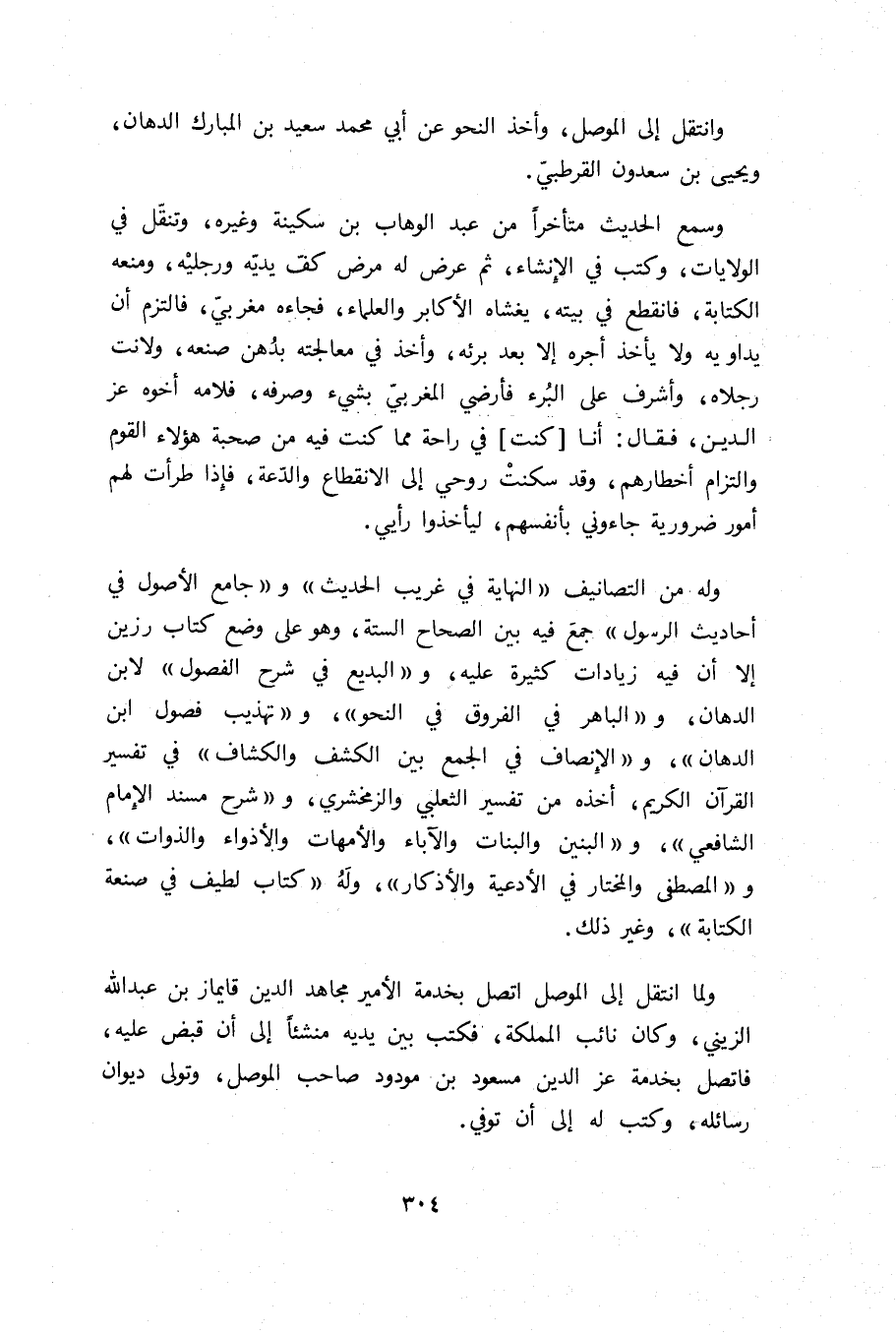وانتقل إلى الموصل، وأخذ النحو عن أبي محمد سعيد بن المبارك الدهان، ويحيى بن سعدون القرطبيّ.