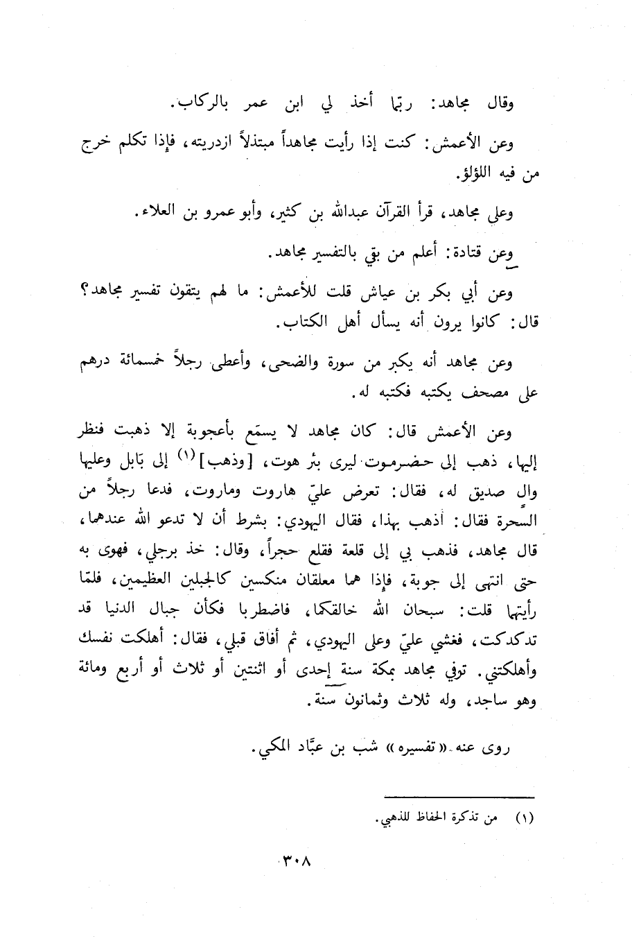 وعن الأعمش قال: كان مجاهد لا يسمع بأعجوبة إلا ذهبت فنظر إليها، ذهب إلى حضرموت ليرى بئر هوت، [وذهب] (¬1) إلى بابل وعليها وال صديق له، فقال: تعرض عليّ هاروت وماروت، فدعا رجلا من السحرة فقال: اذهب بهذا، فقال اليهودي: بشرط أن لا تدعو الله عندهما، قال مجاهد، فذهب بي إلى قلعة فقلع حجرا، وقال: خذ برجلي، فهوى به حتى انتهى إلى جوبة، فإذا هما معلقان منكسين كالجبلين العظيمين، فلمّا رأيتهما قلت: سبحان الله خالقكما، فاضطربا فكأن جبال الدنيا قد تدكدكت، فغشي عليّ وعلى اليهودي، ثم أفاق قبلي، فقال: أهلكت نفسك وأهلكتني. توفي مجاهد بمكة سنة إحدى أو اثنتين أو ثلاث أو أربع ومائة وهو ساجد، وله ثلاث وثمانون سنة.