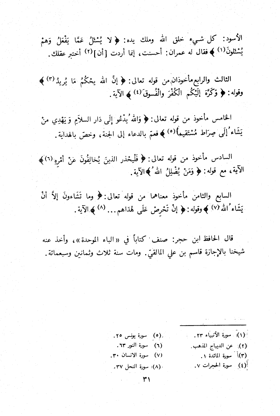 السابع والثامن مأخوذ معناهما من قوله تعالى: وَما تَشاؤُنَ إِلَّا أَنْ يَشاءَ اللَّهُ (¬7) وقوله: إِنْ تَحْرِصْ عَلى هُداهُمْ ... (¬8) الآية.
