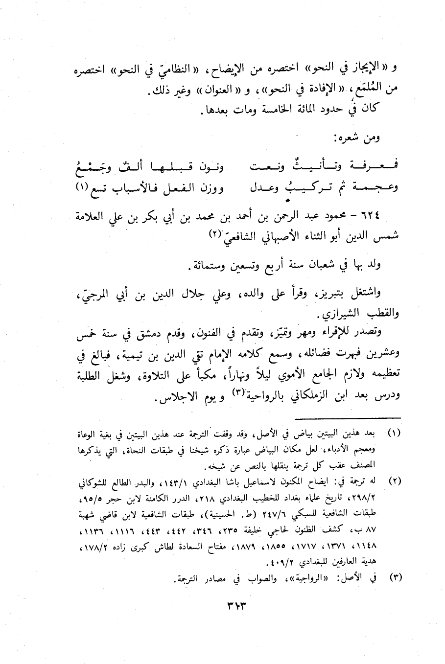 624 - محمود عبد الرحمن بن أحمد بن محمد بن أبي بكر بن علي العلامة شمس الدين أبو الثناء الأصبهاني الشافعيّ (¬2) ولد بها في شعبان سنة أربع وتسعين وستمائة.