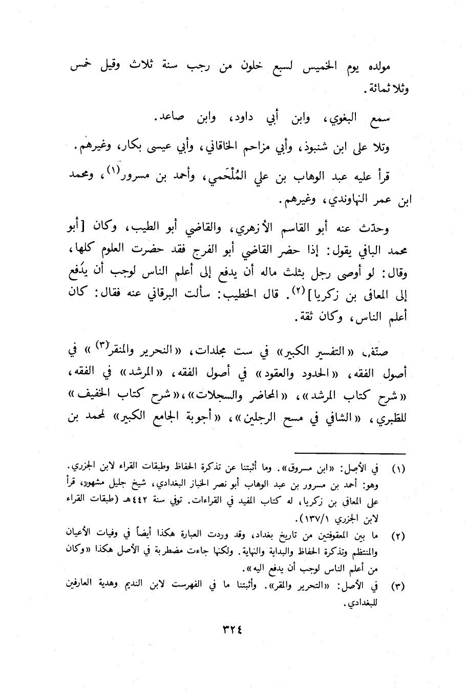 (¬2) ما بين المعقوفتين من تاريخ بغداد، وقد وردت العبارة هكذا أيضا في وفيات الأعيان والمنتظم وتذكرة الحفاظ والبداية والنهاية. ولكنها جاءت مضطربة في الأصل هكذا «وكان من أعلم الناس لوجب أن يدفع اليه».