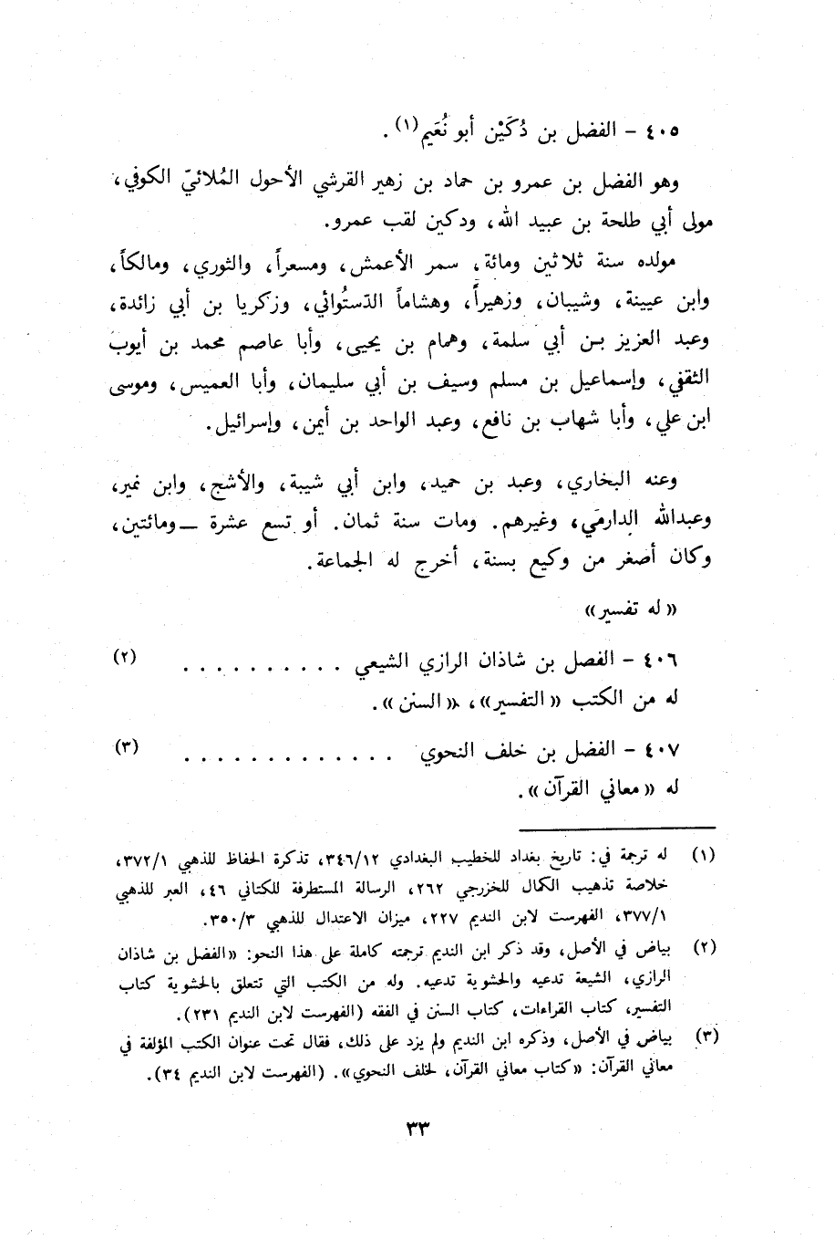 (¬2) بياض في الأصل، وقد ذكر ابن النديم ترجمته كاملة على هذا النحو: «الفضل بن شاذان الرازي، الشيعة تدعيه والحشوية تدعيه. وله من الكتب التي تتعلق بالحشوية كتاب التفسير، كتاب القراءات، كتاب السنن في الفقه (الفهرست لابن النديم 231).