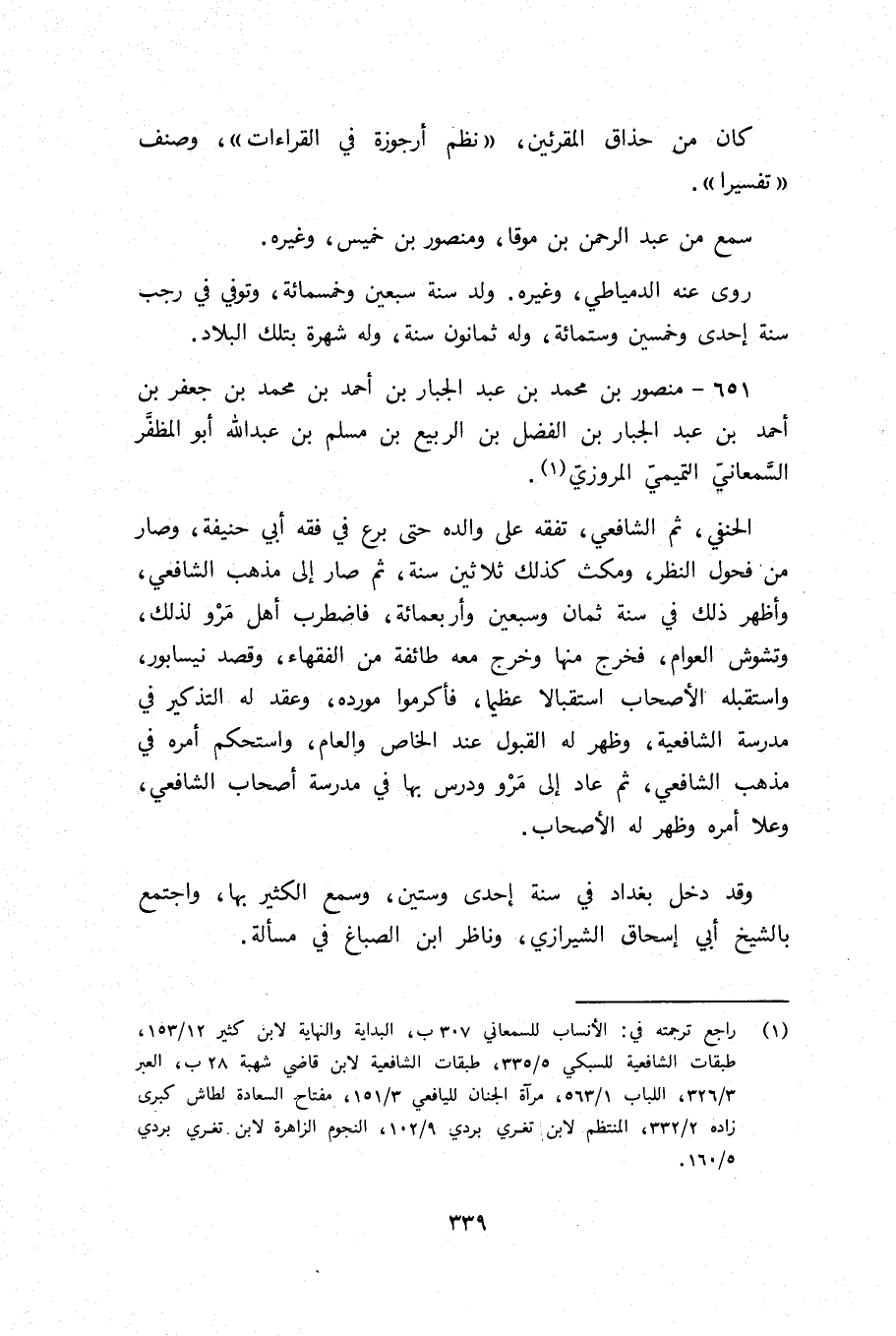 651 - منصور بن محمد بن عبد الجبار بن أحمد بن محمد بن جعفر بن أحمد بن عبد الجبار بن الفضل بن الربيع بن مسلم بن عبد الله أبو المظفّر السّمعانيّ التميميّ المروزيّ (¬1).