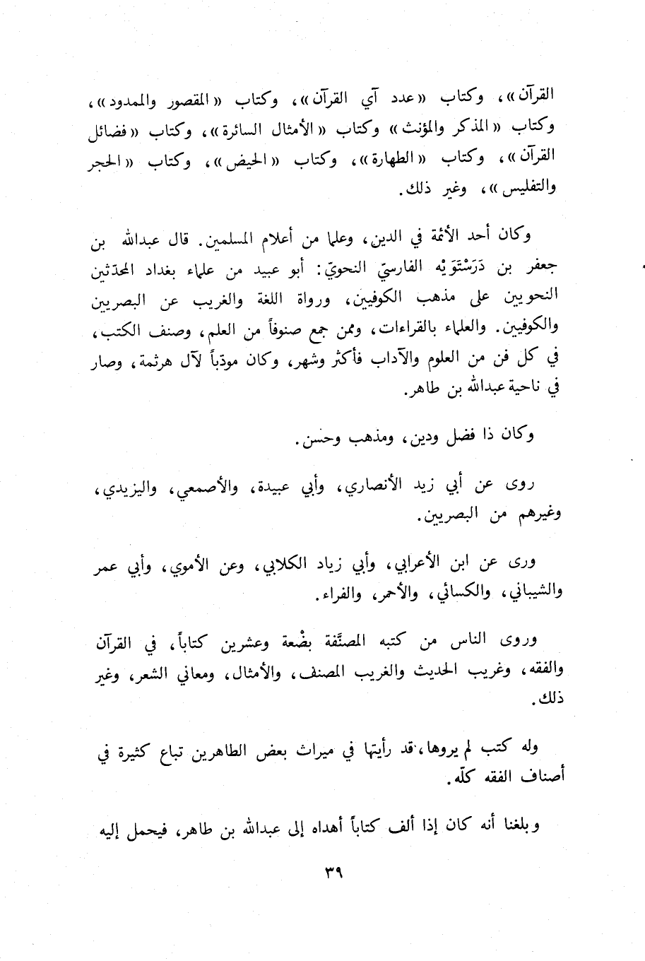 القرآن»، وكتاب «عدد آي القرآن»، وكتاب «المقصور والممدود»، وكتاب «المذكر والمؤنث» وكتاب «الأمثال السائرة»، وكتاب «فضائل القرآن»، وكتاب «الطهارة»، وكتاب «الحيض»، وكتاب «الحجر والتفليس»، وغير ذلك.