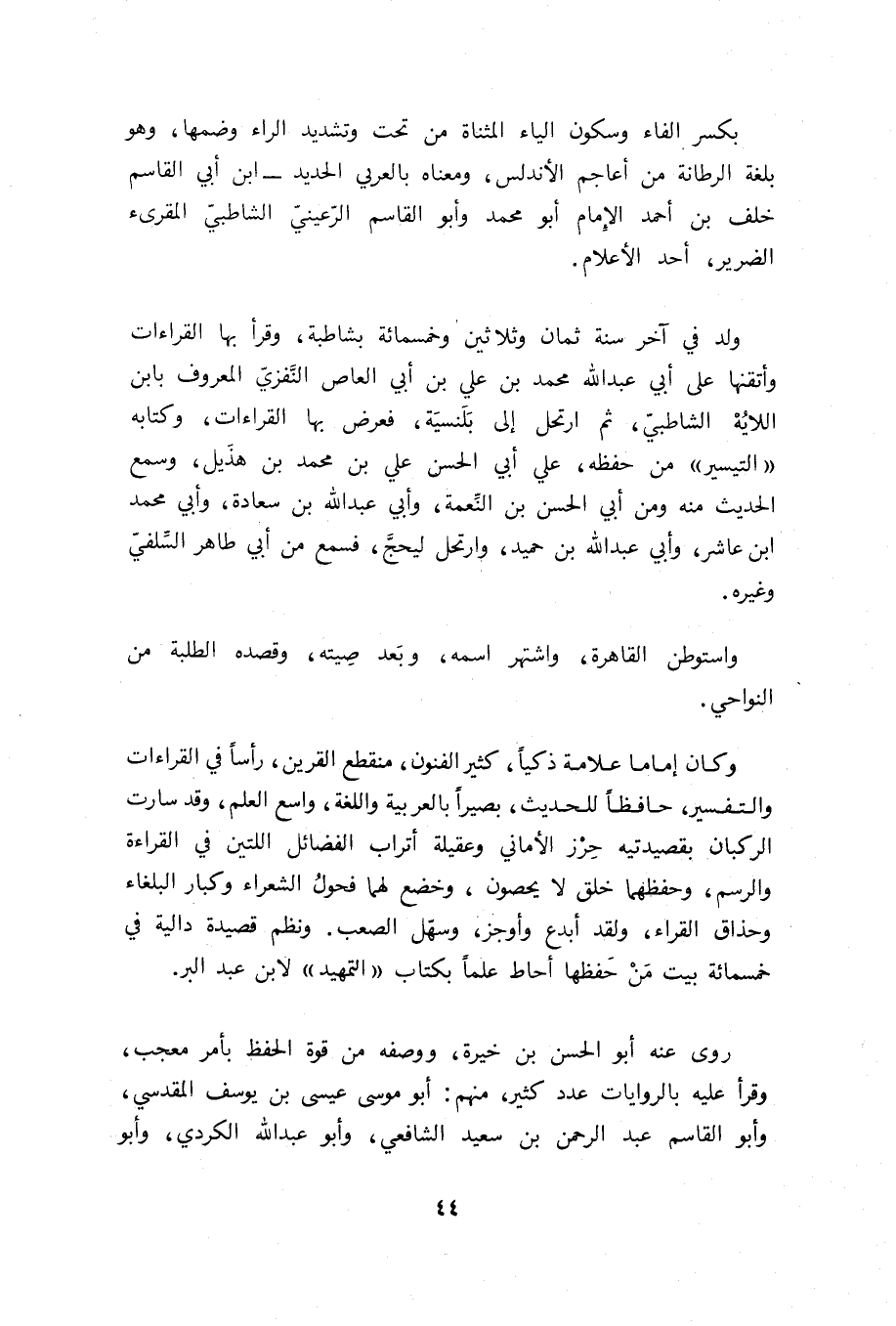 وكان إماما علامة ذكيا، كثير الفنون، منقطع القرين، رأسا في القراءات والتفسير، حافظا للحديث، بصيرا بالعربية واللغة، واسع العلم، وقد سارت الركبان بقصيدتيه حرز الأماني وعقيلة أتراب الفضائل اللتين في القراءة والرسم، وحفظهما خلق لا يحصون، وخضع لهما فحول الشعراء وكبار البلغاء وحذاق القراء، ولقد أبدع وأوجز، وسهّل الصعب. ونظم قصيدة دالية في خمسمائة بيت من حفظها أحاط علما بكتاب «التمهيد» لابن عبد البر.