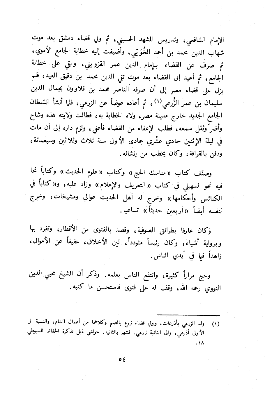 (¬1) ولد الزرعي بأذرعات، وولي قضاء زرع بالضم وكلاهما من أعمال الشام، والنسبة الى الأولى أذرعي، والى الثانية زرعي. فشهر بالثانية. حواشي ذيل تذكرة الحفاظ للسيوطي 18.