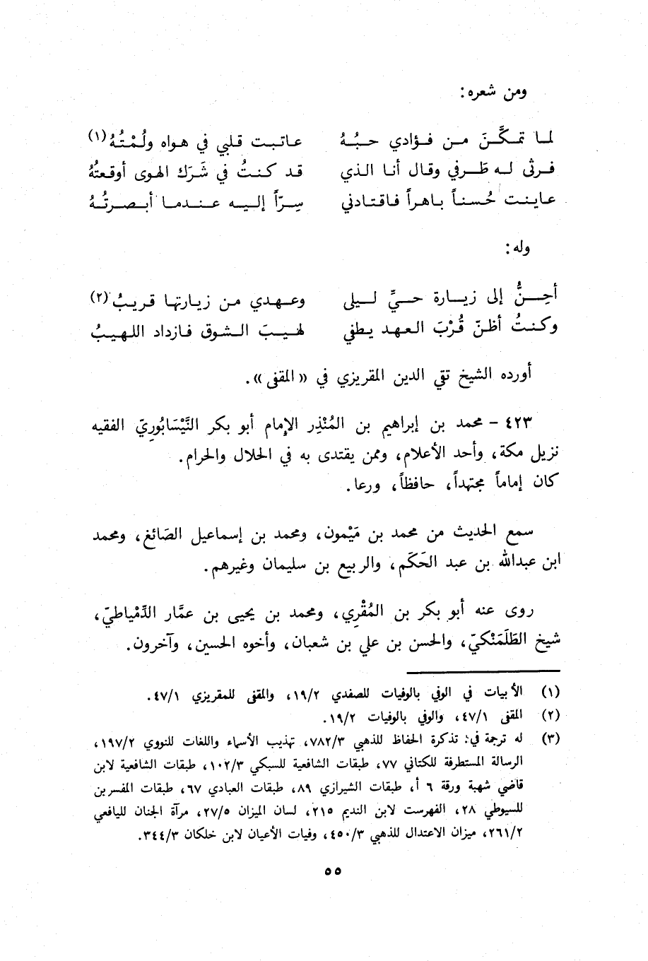 (¬3) له ترجمة في: تذكرة الحفاظ للذهبي 3/ 782، تهذيب الأسماء واللغات للنووي 2/ 197، الرسالة المستطرفة للكتاني 77، طبقات الشافعية للسبكي 3/ 102، طبقات الشافعية لابن قاضي شهبة ورقة 6 أ، طبقات الشيرازي 89، طبقات العبادي 67، طبقات المفسرين للسيوطي 28، الفهرست لابن النديم 215، لسان الميزان 5/ 27، مرآة الجنان لليافعي 2/ 261، ميزان الاعتدال للذهبي 3/ 450، وفيات الأعيان لابن خلكان 3/ 344.