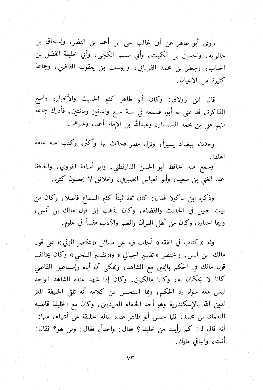 قال ابن زولاق: وكان أبو طاهر كثير الحديث والأخبار، واسع المذاكرة، قد عنى به أبوه فسمعه في سنة سبع وثمانين ومائتين، فأدرك جماعة منهم علي بن محمد السمسار، وعبد الله بن الإمام أحمد، وغيرهما.
