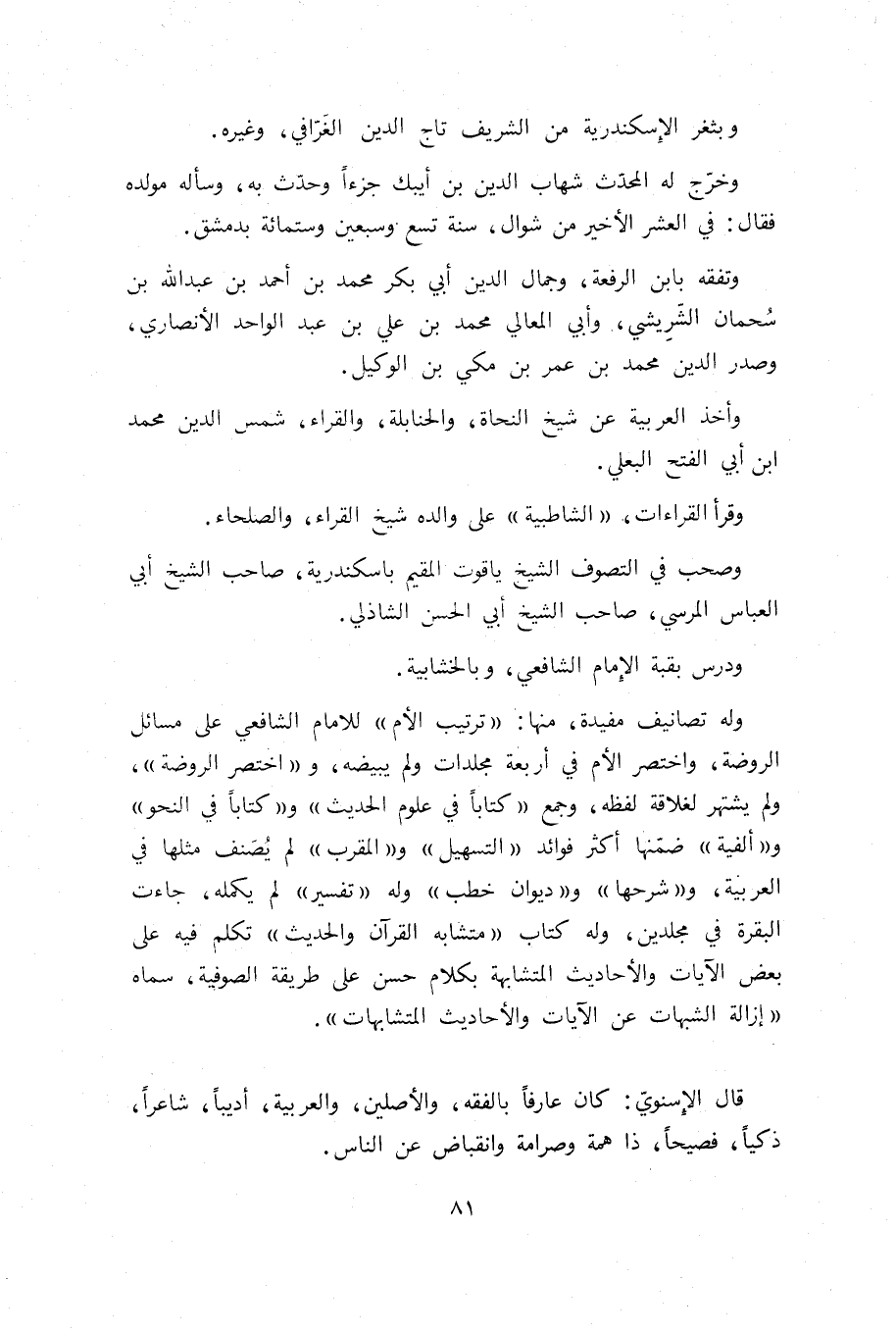 قال الإسنويّ: كان عارفا بالفقه، والأصلين، والعربية، أديبا، شاعرا، ذكيا، فصيحا، ذا همة وصرامة وانقباض عن الناس.