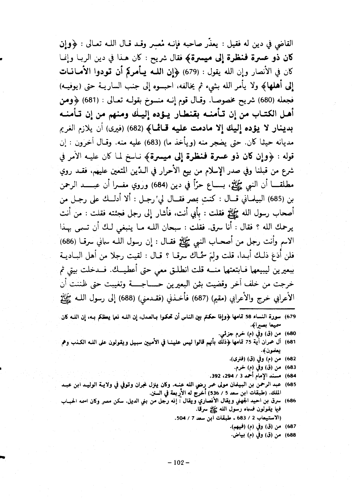 القاضي في دين له فقيل: يعذر صاحب فإنه معسر وقد قال الله تعالى: {وإن كان ذو عسرة فنظرة إلى ميسرة} فقال شريح: كان هذا في دين الربا وإنما كان في الأنصار وإن الله يقول: {إن الله يأمركم أن تؤدوا الأمانات إلى أهلها} ولا يأمر الله بشيء ثم يخالفه، احبسوه إلى جنب السارية حتى يوفيه فجعله شرح مخصوصا. وقال قوم إنه منسوخ بقوله تعالى: {ومن أهل الكتاب من إن تأمنه بقنطار يؤده إليك ومنهم من إن تأمنه بدينار لايؤده إليك إلا ما دمت عليه قائما} فيرى أن يلازم الغريم مديانه حيثما كان. حتى يضجر منه (ويأخذ ما) عليه منه. وقال آخرون: إن قوله: {وإن كان ذو عسرة فنظرة إلى ميسرة} ناسخ لما كان عليه الأمر في شرع من قبلنا وفي صدر الإسلام من بيع الأحرار في الدين المتعين عليهم، فقد روى مطلقا أن النبي صلى الله عليه وسلم باع حرًا في دين وروى مفسرا أن عبد الله بن البيلماني قال: كنت بمصر فقال لي رجل: ألا أدلك على رجل من أصحاب رسول الله صلى الله عليه وسلم فقلت: بأبي أنت، فأشار إلى رجل فجئته فقلتك من أنت يرحمك الله؟ فقال: أنا سرق، فقلت: سبحان الله ما ينبغي لك أن تسمى بهذا الاسم وأنت رجل من أصحاب النبي صلى الله عليه وسلم، فقال: إن رسول الله سماني سرقا فلن ادع ذلك ابدا، قلت ولم سماك سرقا؟ قال: لقيت رجلا من أهل البادية ببعيرين ليبيعهما فابتعتهما منه قلت انطلق معي حتى أعطيك. فدخلت بيتي ثم خرجت من خلف آخر وقضيت بثمن البعيرين حاجة وتغيبت حتى ظننت أن الأعرابي خرج والأعرابي مقيم، فأخذني فقدمني إلى رسول الله صلى الله عليه وسلم.