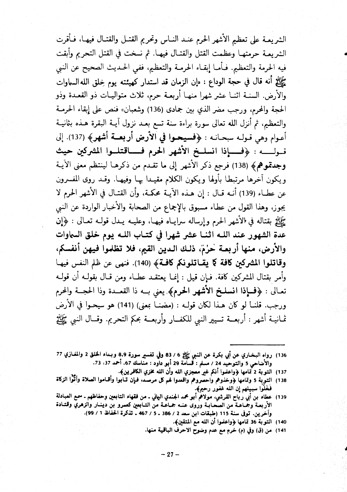 الشريعة على تعظيم الشهر الحرم عند الناس وتحريم القتل والقتال فيها, فأقرت الشريعة حرمتها وعظمت القتل والقتال فيها. ثم نسخت في القتل التحريم وأبقت فيه الحرمة والتعظيم. فأما إبقاء الحرمة والتعظيم, ففي الحديث الصحيح عن النبي صلى الله عليه وسلم أنه قال في حجة الوداع: "إن الزمان قد استدار كهيئته يوم خلق الله السماوات والأرض. السنة اثنا عشر شهرا منها أربعة حرم, ثلاث متواليات ذو القعدة وذو الحجة والمحرم, ورجب مضر الذي بين جمادى وشعبان" فنص على إبقاء الحرمة والتعظيم, ثم انزل الله تعالى سورة براءة سنة تسع بعد نزول آية البقرة هذه بثمانية أعوام وهي قوله سبحانه: {فسيحوا في الأرض أربعة أشهر}. إلى قوله {فإذا انسلخ الأشهر الحرم فاقتلوا المشركين حيث وجدتموهم} فرجع ذكر الأشهر إلى ما تقدم من ذكرها لينتظم معنى الآية ويكون آخرها مرتبطا بأولها ويكون الكلام مقيدا بها وفيها. وقد روى المفسرون عن عطاء أنه قال: إن هذه الآية محكمة, وأن القتال في الأشهر الحرم لا يجوز, وهذا القول من عطاء مسبوق بالإجماع من الصحابة والأخبار الواردة عن النبي صلى الله عليه وسلم بقتاله في الأشهر الحرم وإرساله سراياه فيها, وعليه يدل قوله تعالى: {إن عدة الشهور عند الله اثنا عشر شهرا في كتاب الله يوم خلق السموات والأرض منها أربعة حرم ذلك الدين القيم فلا تظلموا فيهن أنفسكم وقاتلوا المشركين كافة كما يقاتلونكم كافة}. فنهى عن ظلم النفس فيها وأمر بقتال المشركين كافة. فإن قيل إنما يعتقد عطاء ومن قال بقوله أن قوله تعالى: {فإذا انسلخ الأشهر الحرم} يعني به ذا القعدة وذا الحجة والمحرم ورجب. قلنا لو كلن هذا لكان قوله: (مضمنا بمعنى) هو سيحوا في الأرض ثمانية أشهر: أربعة تسيير النبي للكفار وأربعة بحكم التحريم. وقال النبي صلى الله عليه وسلم